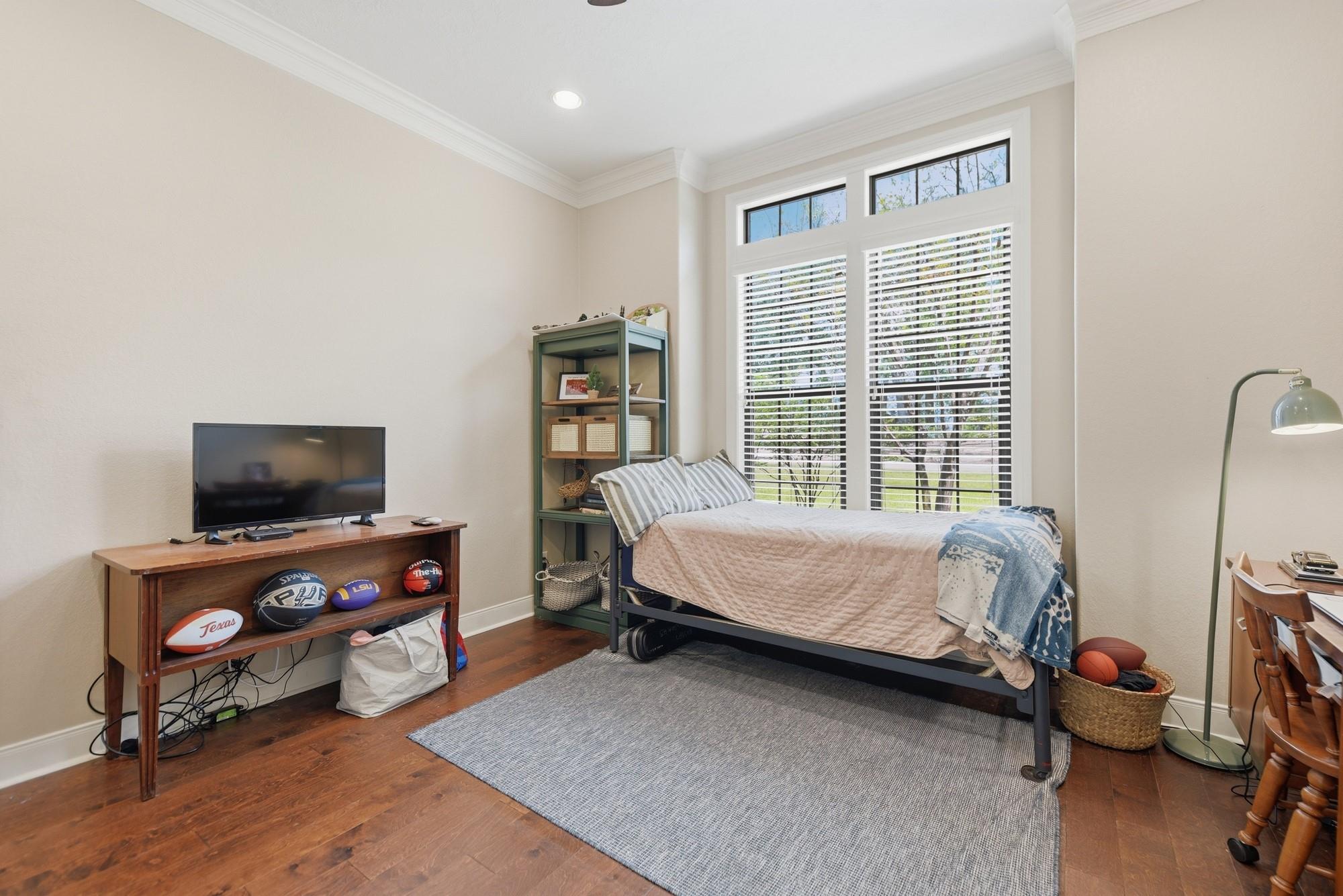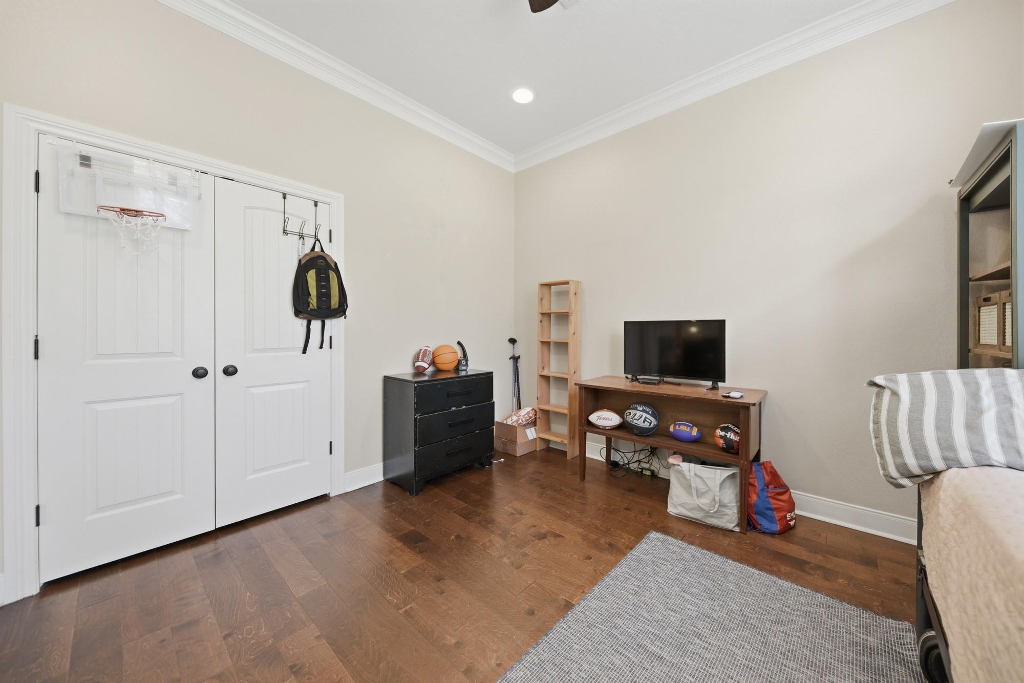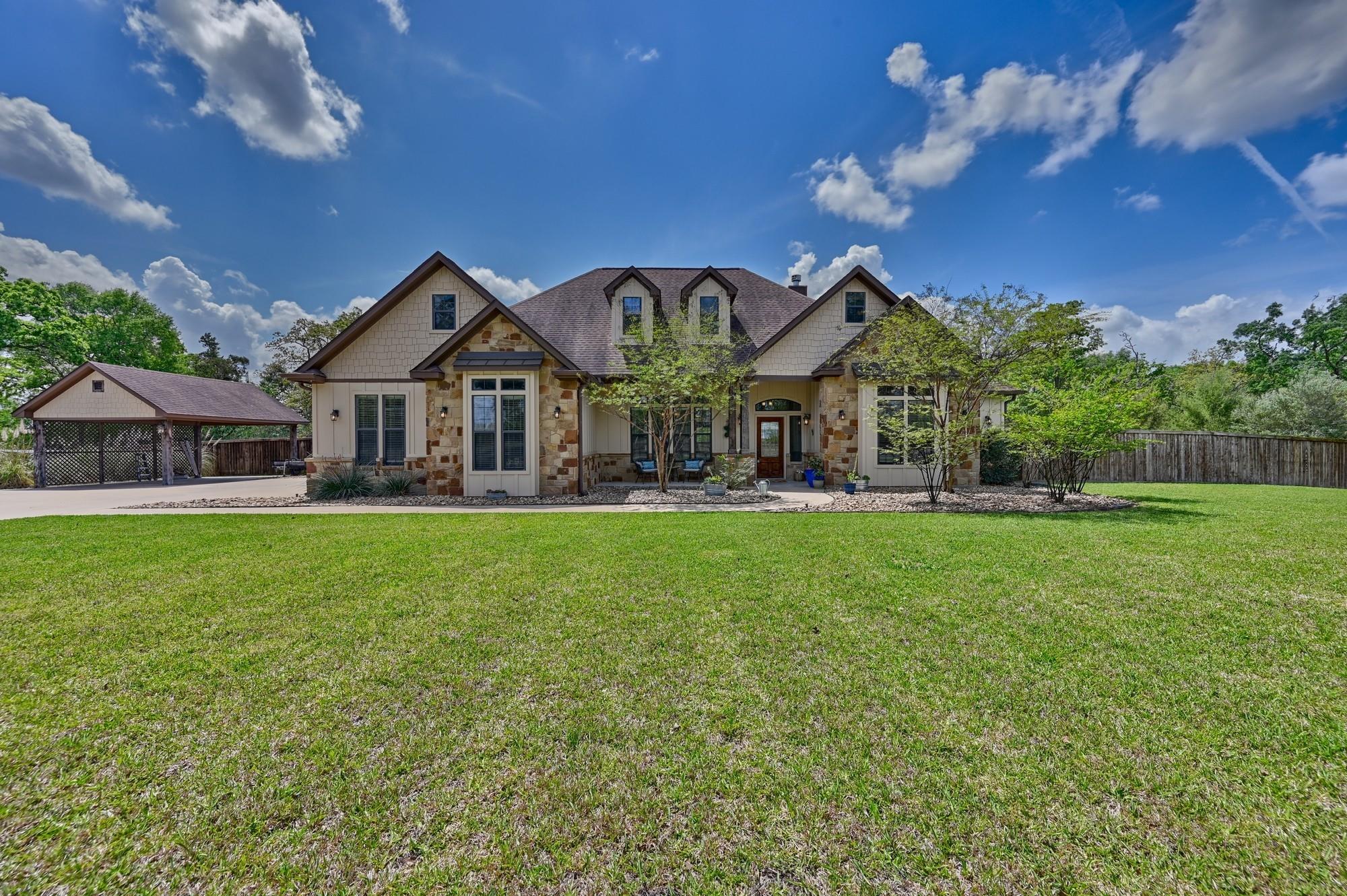 The exterior is equally impressive, featuring a well-kept, oversized backyard with a large covered patio and plenty of room for a pool. Professionally landscaped grounds include a sprinkler system connected to a private water well. A gated entrance, rock flower beds, extra covered parking, and stone and stained wood exterior add to the property's appeal.